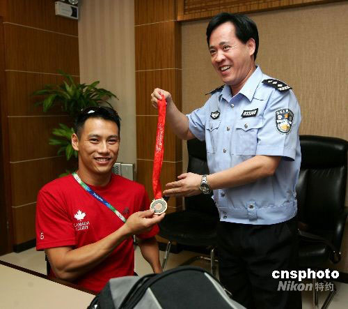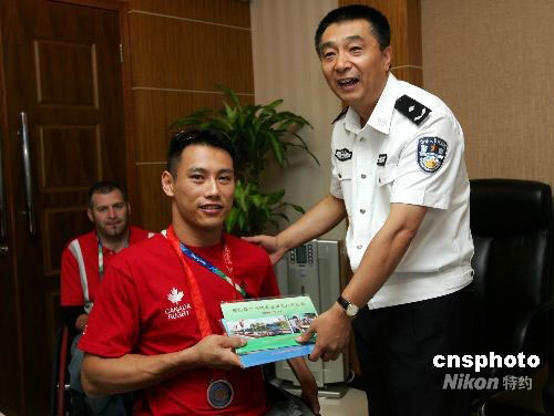 9月18日,一枚失而復得的北京殘奧會獎牌由北京公交民警交還到了加拿大運動員杰瑞德手中。9月17日晚,加拿大運動員杰瑞德在乘坐出租車時不慎將自己的雙肩包遺忘在車上,公交民警接警后,在線索非常有限的條件下,只用了四個小時,就將背包找回,里面有一枚寶貴的殘奧會橄欖球銅牌。中新社發(fā) 富田 攝