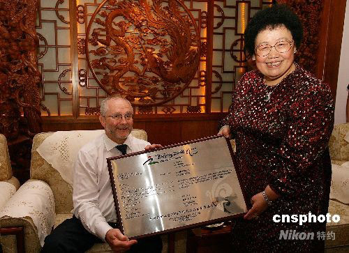 菲利普·克雷文代表國(guó)際殘奧委會(huì)向陳麗華館長(zhǎng)贈(zèng)送感謝狀。中新社發(fā) 毛建軍 攝