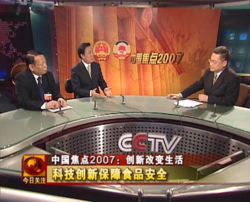 好,觀眾朋友,歡迎繼續(xù)收看我們的“兩會(huì)”特別報(bào)道:中國焦點(diǎn)2007年。今天,我們關(guān)注的是科技創(chuàng)新這個(gè)話題。今天演播室我們特別邀請到了兩位權(quán)威的嘉賓,我來介紹一下,一位是科技部副部長尚勇先生,你好,尚部長。