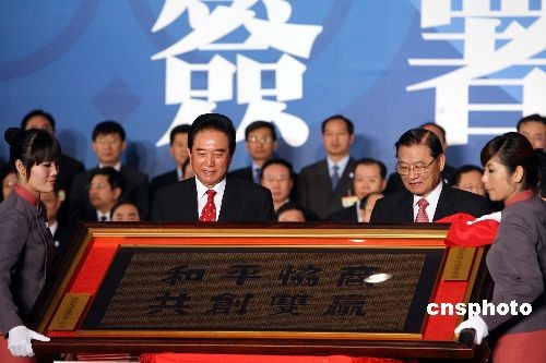 圖:江丙坤贈(zèng)陳云林"和平協(xié)商 共創(chuàng)雙贏"匾額