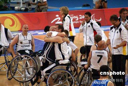 男子輪椅籃球德國(guó)隊(duì)"輪椅擁抱"慶勝利