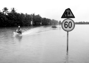 瓊海嘉積鎮(zhèn)多條道路遭受內(nèi)澇。17日下午2時許,南國都市報記者徒步趟過3公里積水路段,來到上次受災嚴重的嘉積鎮(zhèn)橋頭村委會。該村委會通往嘉積的兩條道路豪華路、嘉博路部分路段積水超過1米。如果不是路邊豎立的路燈,很難分清哪里是道路,哪里是路邊水田。