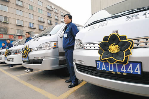 白、灰、棕三色相間的車身上有“沈陽(yáng)殯儀”標(biāo)志,號(hào)牌后三位均為“444”。10月28日,沈陽(yáng)市殯儀車集體換裝,在全國(guó)率先開始統(tǒng)一殯儀車標(biāo)識(shí)。年底前,全市70多輛正規(guī)殯儀車將全部“變身”換裝。