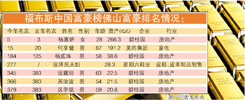 對比20天前剛剛發(fā)布的胡潤富豪榜,在佛山富豪方面,新的福布斯排行榜表現(xiàn)出了上榜人數(shù)少、富豪身家縮水的特點。例如楊惠妍在胡潤榜上顯示的財富是330億元,而福布斯顯示為266.3億元,而何享健的身家也縮水4億元。此外,格蘭仕梁德慶、金盛盧氏等在胡潤榜單中有優(yōu)秀表現(xiàn)的本地富豪在福布斯中卻不見蹤影。