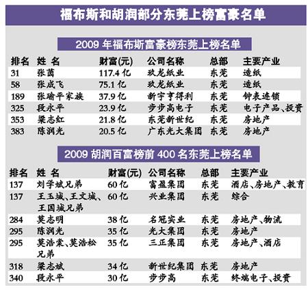2009福布斯中國富豪榜昨日(11月5日)發(fā)布。記者從榜單上獲悉,福布斯富豪榜上王傳福以396億元位列第一,其中公司總部在東莞的上榜富豪有6位,張茵以財(cái)富117.4億元排名東莞第一,在整個(gè)2009福布斯中國富豪榜上排名第31位,其弟弟張成飛則緊追其后排名東莞第2。