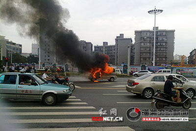 目擊者介紹,小車起明火后,頓時濃煙彌漫,一度影響交通。交警立即在現(xiàn)場指揮疏導(dǎo),等待消防前來滅火。10分鐘后,火被熄滅,但是貨車也燒得“不成模樣”。