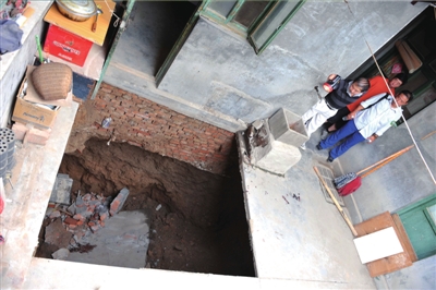 昨天上午,記者在現(xiàn)場(chǎng)看到,這處塌陷坑位于院子的東北側(cè),上面一塊長(zhǎng)近3米、寬近2米的石板整體隨之塌了下去。從坑內(nèi)可以看得到房子的地基。