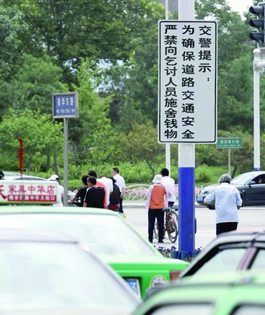近來(lái),在省城石家莊“迎賓大道”裕華路與建設(shè)大街交叉口,交管部門豎起的兩塊“新式”交通警示牌引發(fā)市民議論!盀榇_保道路交通安全,嚴(yán)禁向乞討人員施舍錢物”的警示語(yǔ)赫然入目,對(duì)此,記者在采訪中也聽(tīng)到了社會(huì)各界的一些不同看法。