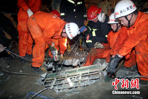 隨著救援進(jìn)程在加快,一塊塊阻礙救援的鋼筋混凝土樓板和房梁被移開!袄靡簤褐喂ぞ甙褬前鍝纹饋,夾縫里有人!”為避免現(xiàn)場再次塌落,救援官兵利用液壓支撐工具把三樓樓板撐起來。21時55分,消防官兵在現(xiàn)場北面搜又救出1名被埋人員。
