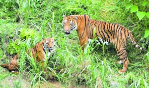 昨天上午9時30分,當(dāng)科研人員再度打開兩只華南虎的房門時,血氣方剛的王子便急不可耐地沖了出來,跑到公主門前欲“重溫鴛夢”。