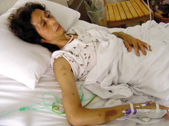 據(jù)該帖描述,陳玉蓮頭上、身上、胳膊上、腿上遍布傷痕。診斷結(jié)果是,她被打成腦震蕩,軟組織挫傷幾十處,左腳功能障礙,植物神經(jīng)紊亂……她躺在病床上,渾身哆嗦,嘔吐腹瀉不止,發(fā)燒幾天,身心受到了重創(chuàng)。陳玉蓮的妹妹陳翠蓮昨晚接受羊城晚報(bào)記者采訪時(shí)說(shuō),陳玉蓮剛打過(guò)針,因腦震蕩影響,正在病床上昏睡,而她左腳至今無(wú)法踏地。