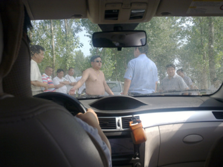 面對民警,在摩托車被推開后,不明身份人員仍不愿放行,“金鏈子”裸著上身更是蹲在車前不肯起來,稱“除非賠我們莊稼錢”……經(jīng)民警多次勸說,記者終于在當日下午4時許安全抵達了狼城崗鎮(zhèn)政府。