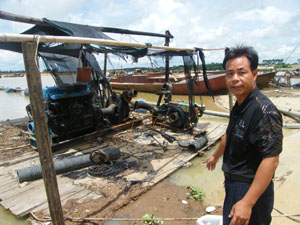 昨天上午11時(shí)許,記者與梁先生一同到現(xiàn)場(chǎng)了解情況。梁先生的金江沙場(chǎng)位于定安定城鎮(zhèn)和?谛缕骆(zhèn)交界處,已經(jīng)暫停作業(yè),工人們?cè)诠づ镄菹。記者在采沙船被毀現(xiàn)場(chǎng)看到,采沙船擱淺在岸邊,采沙機(jī)器完全被毀,電池?zé),木板千瘡百孔,表面被大火熏得烏黑,?nèi)部零件完全破壞。雖然距離案發(fā)已有10余天,當(dāng)時(shí)大火熊熊燃燒的情景依然可以想見。