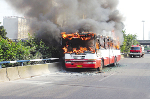 早8點(diǎn)35分,北京市東南三環(huán)華威橋南側(cè)一輛638路公交車發(fā)生自燃,司機(jī)在發(fā)現(xiàn)危險情況后立即將公交車停靠輔路安全地帶,疏散車內(nèi)乘客,并報(bào)警,8時50分,公交車大火被消防員迅速撲滅。