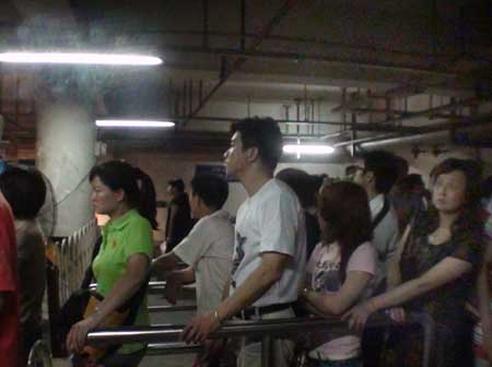 7月29日晚9點(diǎn)多,記者進(jìn)入火車站出站口,沿著指示牌上的“的士候客點(diǎn)”,隨人流一起來到地下停車場(chǎng)昏暗高溫的地下停車場(chǎng)里乘客們個(gè)個(gè)汗流浹背 排著,長隊(duì)等候出租車。奇怪的是,偌大的停車場(chǎng)內(nèi),看不到一輛出租車。