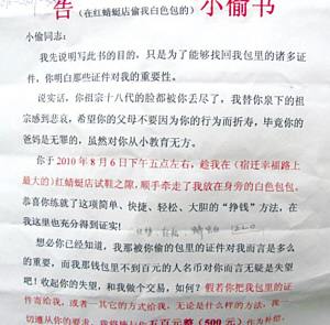 小陳在《告小偷書》中寫到:“假若你把我包里的證件寄給我,或者以其他的方式給我,無論是什么樣的方法,我一切遵從你的要求,我將施與你500元作為補(bǔ)償。因?yàn)槲沂敲麑W(xué)生,無更多的經(jīng)濟(jì)能力!衷心希望與你私下和解此事!”