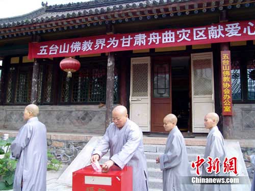 當(dāng)甘肅舟曲泥石流災(zāi)害的消息傳到五臺山時,再次揪疼了五臺山僧眾的心。為幫助受災(zāi)群眾順利重建家園,身在佛門心系天下蒼生的他們,不論是黃廟的,還是青廟的,不論貧富,不分遠(yuǎn)近的大大小小的40多處寺廟和近千個四眾弟子,以同樣真切和濟(jì)世之情,共同援手,在不到一個小時的時間里,捐款數(shù)達(dá)到了53.6380萬元人民幣,其中普壽寺捐款10萬元,萬佛閣6萬元,塔院寺5.5萬元、普化寺5萬元,其它寺院均盡自己的力量出資捐助。目前,善款已轉(zhuǎn)交有關(guān)部門,但捐款活動仍在繼續(xù)進(jìn)行。