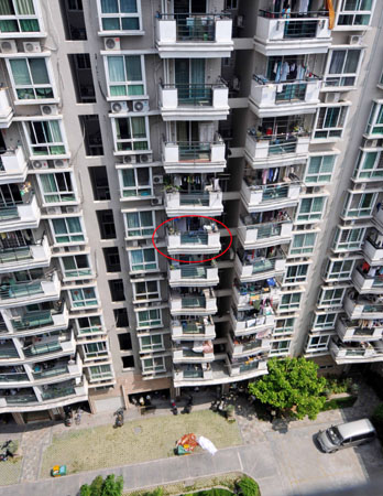 住在小區(qū)2號樓的老王目擊了整個過程。“他當(dāng)時半蹲著,雙手緊抓著陽臺護欄,雙腳踩在陽臺外側(cè)的邊沿上!崩贤跻贿吥7履凶赢(dāng)時的姿勢,一邊說,“他嘴里一直在喊救命,小區(qū)門口的保安聽到后趕緊往那邊跑,我也趕過去想幫助救人。保安剛到樓下,那小伙子的左腳突然滑下來,他往上蹬了幾下,沒蹬上去,右腳也跟著滑了下來,僅靠雙手抓住護欄。沒幾秒鐘,人就摔了下來。”