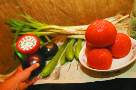 沿著水泥修葺的臺(tái)階而下,記者感到非常涼爽,前行約兩米,一間約10平方米的住所呈現(xiàn)在眼前。房間四周刷得雪白,床上的被褥干凈,音響、書架擺放在床前。床的兩端,挖掘出高2米、寬約70厘米的巷道,在昏暗燈光的照射下,靜謐、溫馨。巷道墻壁上,被挖出多個(gè)平臺(tái),哈密瓜、啤酒、黃瓜等放置在上面!暗叵率19攝氏度,把食品放這兒,就像放冰箱里一樣!标愋履暾f。