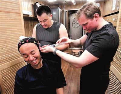 王躍(左一)在模擬艙內(nèi)進行腦電極試驗。俄羅斯生物醫(yī)學問題研究所供圖