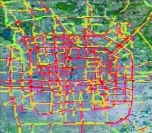 昨日晚高峰城區(qū)路況圖(紅色為擁堵路段)。視頻截圖