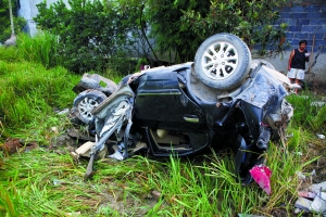 昨日凌晨,四川閬中市巴都大道發(fā)生一起車禍,一輛小轎車越過37米寬的稻田飛上二樓,將居民住房撞了一個直徑約1米的大窟窿。據圍觀的士司機介紹,小轎車能飛越37米寬的稻田,時速至少在每小時180至200公里以上。