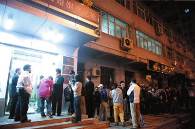 據(jù)了解,絕大部分婚登機(jī)關(guān)在早6點(diǎn)開門辦公,少數(shù)幾個區(qū)如朝陽婚登處因為有新人早早就來排隊,在零點(diǎn)就開門為新人辦理登記手續(xù)。