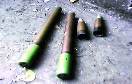 正在這時,劇組那名工作人員發(fā)現(xiàn)了異樣。在一個堆著啤酒瓶、廢紙的地方,有4根鐵的條狀物很是怪異:長的2根有1尺多長,一頭是綠色的,一頭是棕色的;另外2根很短,是圓錐體,尖上是白色的,身體是棕色的,尾部又是黑色的!鞍⊙,這里有火箭彈!”這員工一聲喊,把周圍的人嚇了一大跳。
