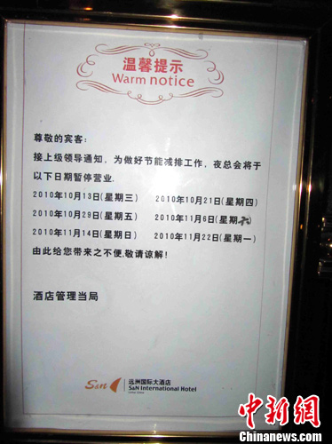 在四星級的臺州國貿(mào)飯店大堂,記者看到一張通知:接文廣新局通知,本市娛樂行業(yè)將要進行節(jié)能減排輪休,因此本飯店(KTV)在10月25日、11月2日、11月10日、11月18日暫停營業(yè)。