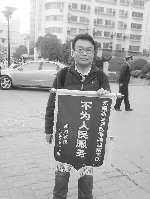 其實(shí)我一共做了三面錦旗。最早的一面9月份做的“起訴通用工會(huì)法院不受理”,給無(wú)錫新區(qū)法院的!安粸槿嗣穹⻊(wù)”是給勞動(dòng)保障監(jiān)察大隊(duì)的。第三面還是給法院的,寫(xiě)的“行政訴訟立案難”,還沒(méi)送出去,F(xiàn)在看來(lái)第二面最受歡迎。