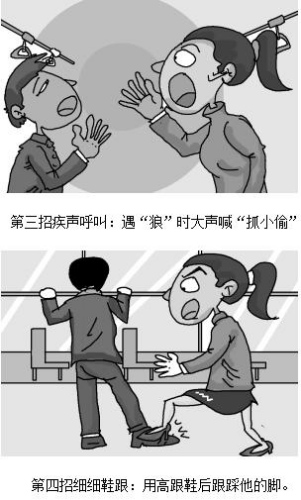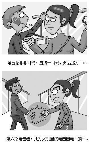 《公交防狼全手冊》發(fā)出后,引起了眾多女性關(guān)注,幾個小時之內(nèi)就有數(shù)以萬計(jì)的網(wǎng)民點(diǎn)擊,其中防狼六招也成為女性之間互轉(zhuǎn)的信息。這六招分別是:第一招冷冷目光,是用威懾力眼神與“狼”對視;第二招尋找依靠,即向司機(jī)或者售票員靠近;第三招疾聲呼叫,就是遇“狼”時大聲喊“抓小偷”;第四招細(xì)細(xì)鞋跟,就是用高跟鞋后跟踩他的腳;第五招狠狠耳光,就是直接打耳光,然后報(bào)警;對于第六招就更有意思了,就是用一次性打火機(jī)里的電擊器電“狼”,產(chǎn)生瞬間電壓足以讓“狼”手彈回去,而且不產(chǎn)生直接傷害。