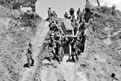 22日,解放軍官兵幫助永光村受災(zāi)群眾將棺材抬到下葬地點。