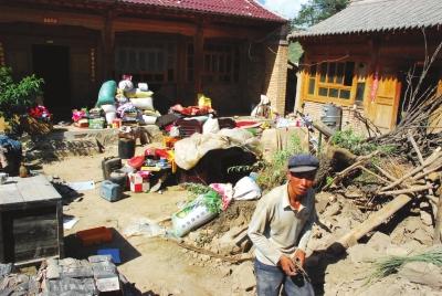 吃完飯后,董春暉扛著工具下地拔草,其他的一家老小4口人便開(kāi)始清理倒塌的兩間房屋。董大娘告訴記者,這座房屋有四間是前年蓋的磚瓦房,有兩間是土坯房。7月22日,甘肅岷縣漳縣發(fā)生6.6級(jí)地震后,這兩間土坯房倒塌了,當(dāng)時(shí)幸虧家人都在磚瓦房里,否則真的不敢想象!斑^(guò)一會(huì)武警官兵過(guò)來(lái)幫忙把兩間土坯房拆除,如果不是地震,這兩間房子再住十年也沒(méi)問(wèn)題。”董大娘惋惜地說(shuō)。