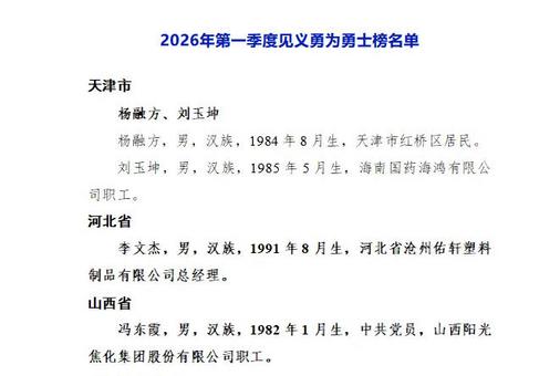 2026年第一季度見(jiàn)義勇為勇士榜名單