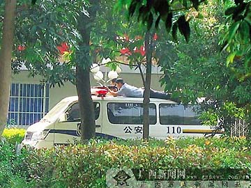 當(dāng)日上午9時15分,記者在南寧市第八人民醫(yī)院內(nèi)見到,醫(yī)院籃球場南側(cè)一片樹林里,一頭水牛正站在樹間吃草,籃球場邊?恐鴥奢v警車,有持槍民警在附近警戒。