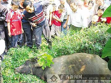 10月21日,一頭水牛被牽進(jìn)南寧市明秀西路細(xì)新巷時,受驚奔走,接連撞倒1男3女后,竄進(jìn)了南寧市第八人民醫(yī)院內(nèi)一片樹林里。上午10時47分,一聲槍響,水牛被民警擊斃。
