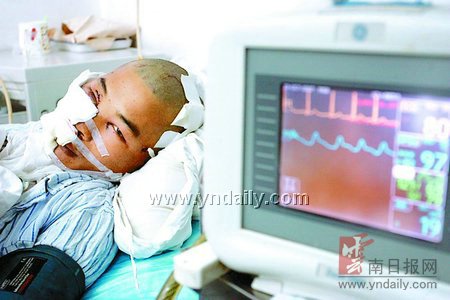 昨日,實(shí)施了面部縫合手術(shù)后,29歲的陳三拉靜靜地躺在昆醫(yī)附一院口腔頜面外科病床上,他的右臉全部被包了起來,由于傷勢(shì)嚴(yán)重,已經(jīng)很難開口說話。
