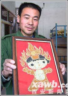 據(jù)陳群虎介紹,一次偶然的機會,他從雜志上看到一篇報道,北京有人用五谷雜糧經(jīng)過處理以后做出了衣服,他想既然能用糧食做衣服,也就能用糧食寫字作畫。隨后,陳群虎便放下手頭的工作,專門來創(chuàng)作他的五谷字畫。經(jīng)過半年多的研究學習和嘗試,陳群虎終于成功創(chuàng)作出了具有濃濃鄉(xiāng)土氣息的“五谷字”。他的作品全都是用草籽、糜子、豆子谷物制作而成,字畫中的顏色也都是用這些顏色各異的谷物搭配成的。他作畫時用的工具都是在果樹嫁接時用的嫁接刀、鑷子、鋸等。陳群虎告訴記者,現(xiàn)在已經(jīng)有不少作品被鄉(xiāng)親們收藏了,這給了他極大的鼓舞和激勵,他將一直創(chuàng)作下去。(記者 張海鵬文/圖)