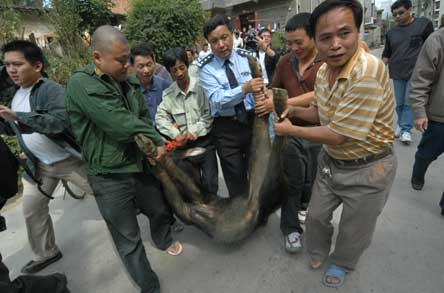 記者隨即向福州市森林公安局反映,該局局長親自帶人到場查看,確定了這是一只蘇門羚。由于該羚羊約重100公斤,森林公安請來了福州市動(dòng)物園兩位專家支援。為避免其傷人,專家決定先對其麻醉。