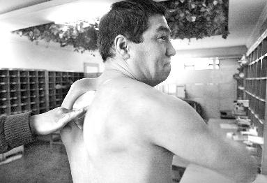 同事小童告訴記者,一次,郵政局運(yùn)羊毛,20公斤的大袋子要抬到約1.3米高的車廂上,其他人都是兩人抬一袋,可阿里甫一人提兩袋,只見他一手抓一袋,很輕松就把一袋羊毛扔到車上。“我們本來就佩服他的力氣,現(xiàn)在他能用肩胛骨夾斷光碟,我們更佩服他了。”小童說。