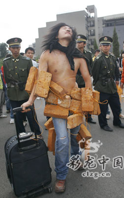 又是他!繼今年5月1日在南屏步行街以全身貼滿人民幣的形式進(jìn)行了一場(chǎng)名為“金錢加權(quán)力等于一切嗎”的行為藝術(shù)后,云南藝術(shù)學(xué)院03級(jí)油畫班畢業(yè)生王軍昨天背負(fù)磚頭行走兩個(gè)多小時(shí),用他覺得最棒的方式說一聲:“昆明,我走了。”