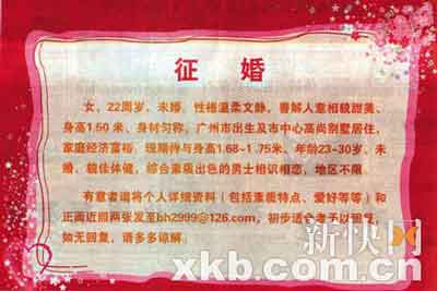 昨日記者走訪了與該征婚廣告有聯(lián)系的幾家廣告公司后獲得證實:征婚女子真實存在,而且確實是廣州本地人。不過幾大報社接手該征婚廣告單的業(yè)務(wù)員們均未見過該女子。