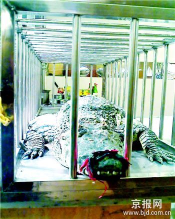 昨晚7時,記者來到位于魏公村的美洲島國際美食中心,在餐臺盡頭的中餐區(qū),一只長約160厘米、寬80厘米的鐵籠子隱藏在食物中間,一只身長約1.7米的鱷魚一動不動地趴在里面,顯得毫無生氣。鱷魚的尾巴蜷縮起來,眼睛緊閉,大嘴被一圈圈紅布綁得緊緊的。鱷魚兩旁趴著兩只大草龜,正努力地想往鱷魚背上爬。