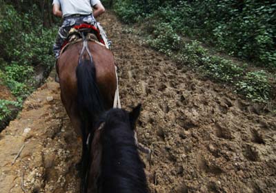 按這里的規(guī)矩,如果你之前沒有騎過馬,馬主人會慫恿你請一個養(yǎng)馬人領(lǐng)馬,這樣做的確是“為了你的安全”,可加上領(lǐng)馬人自然就多了一匹馬,而這匹領(lǐng)馬的費用與我們租用一匹馬的費用相同,同樣也由游客承擔。當日,我們與一名養(yǎng)馬的女主人談定價格準備騎馬上山時,忽然風雨大作,眼看本來泥濘的馬道積滿了更多的雨水,大家只好掃興地放棄騎馬上山的打算。