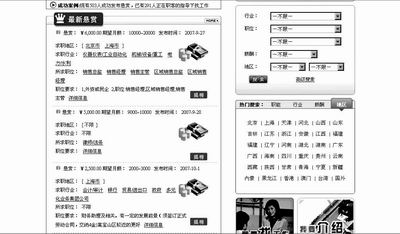 “現(xiàn)有503人成功發(fā)布懸賞,已有291人正在職客的指導(dǎo)下找工作!贝蜷_一家域名為http:///的職客網(wǎng),不斷更新的數(shù)字赫然入目。眾多職客網(wǎng)上,求職“懸賞令”通常被當作“招牌”掛在網(wǎng)站的首頁。