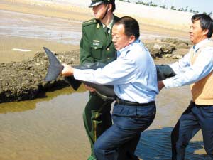 昨天上午,膠南市開發(fā)區(qū)管委兩河村村民王先生到海邊買魚時(shí),發(fā)現(xiàn)漁船捕撈上來的一條1米多長(zhǎng)的小海豚被一魚販買去,聽到該魚販要將海豚轉(zhuǎn)賣給酒店時(shí),王先生立即出千元高價(jià)將這條海豚買回,然后養(yǎng)在自家的蝦池里準(zhǔn)備放生。昨天上午11時(shí),在膠南市漁政部門的見證下,這條小海豚被放歸大海。