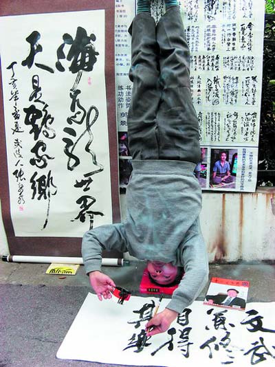 這次張老來(lái)長(zhǎng),是受友人之邀,前來(lái)與本地的書法名家切磋技藝,為此,他才在清水塘古玩市場(chǎng)擺攤展示絕活。頭頂著一本厚厚的書,兩手撐地,雙腳并攏微收,慢慢向上伸直,待身體立穩(wěn)后,左手端墨,右手握筆,連貫地在紙上龍飛鳳舞一番,“吃得苦中苦,方為人上人”幾個(gè)字,在他那蒼勁有力的揮毫中,在雪白的宣紙上漸漸成型。“我很佩服爸爸這種持之以恒、吃苦耐勞的精神,像我們這種連年輕人都做不到的事情,他卻能夠做到,這種挑戰(zhàn)自我、戰(zhàn)勝自我的自信非常值得我學(xué)習(xí)!睆埨系呐畠簭埩岣锌。雖然張老能夠倒立寫書法,但是寫出來(lái)的字還沒達(dá)到正常姿勢(shì)寫字的水平,不過(guò)他表示,只要繼續(xù)苦練,倒立書法的水平一定會(huì)大有長(zhǎng)進(jìn)。(盛磊 舒薇 國(guó)光)