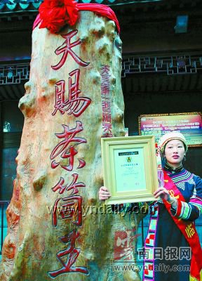 記者看到大茶筒上面刻有“天賜茶筒王”字樣,把茶放到這么高的茶筒里,要取茶方便嗎?工作人員從茶筒的下方打開(kāi)了一道小門,里面的小茶坨就滾了出來(lái),一點(diǎn)都不麻煩。當(dāng)天,上海大世界基尼斯總部給大茶筒頒發(fā)了“大世界基尼斯之最,最大的古樹(shù)茶筒‘天賜茶筒王’的證書”。