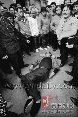 記者在現(xiàn)場看到,傷者躺在馬路中間,妻子抱著丈夫滾在地上痛哭不已,上百名圍觀市民看到這種狀況,紛紛譴責執(zhí)法人員。情緒激動者還將執(zhí)法人員圍住,現(xiàn)場一片混亂,該路段交通短暫堵塞。十多分鐘后,傷者被執(zhí)法人員抬到路邊,交通得以緩解。