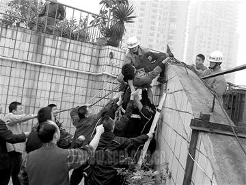 記者趕到現(xiàn)場(chǎng)時(shí),正當(dāng)消防戰(zhàn)士準(zhǔn)備著手解救該男子。記者看到,現(xiàn)場(chǎng)有數(shù)百居民圍觀。跳樓男子站在一7層高樓樓頂外側(cè)的巨幅廣告牌鋼架上,樓下警方拉起了警戒線。幾名身系保險(xiǎn)繩的消防戰(zhàn)士從該樓樓頂慢慢攀爬上了巨幅廣告牌鋼架。驚心動(dòng)魄的一刻終于發(fā)生了,消防戰(zhàn)士將該男子拉住,并用隨身攜帶的安全繩縛住男子身體,將男子從鋼架轉(zhuǎn)移至樓頂,整個(gè)解救過(guò)程,歷時(shí)40余分鐘。